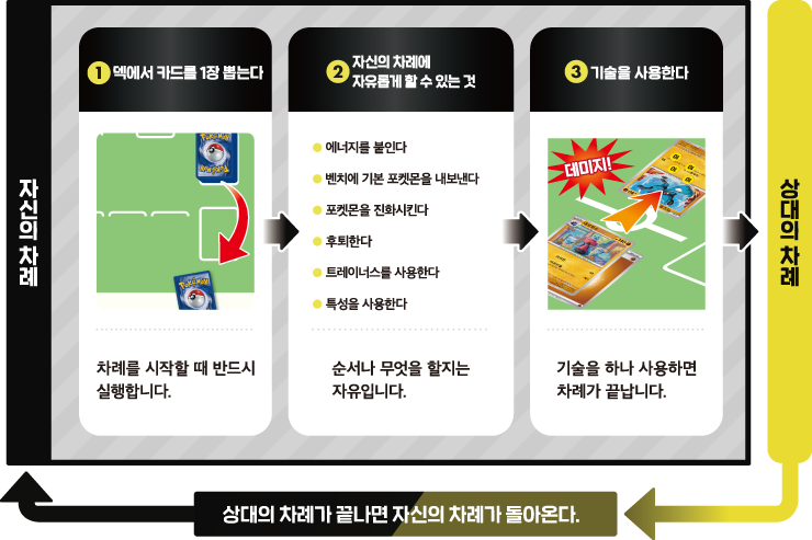 먼저, 상대방에게 패를 보여주고 「기본 포켓몬」이 패에 없음을 확인 받아 주세요.그리고 패를 전부 덱으로 되돌리고 덱을 잘 섞어 다시 7장을 뽑아주세요. 자신이 덱을 다시 뽑은 횟수만큼 상대방은 덱에서 카드를 추가로 뽑을 수 있습니다. 뽑을지 말지는 상대가 선택할 수 있습니다.
